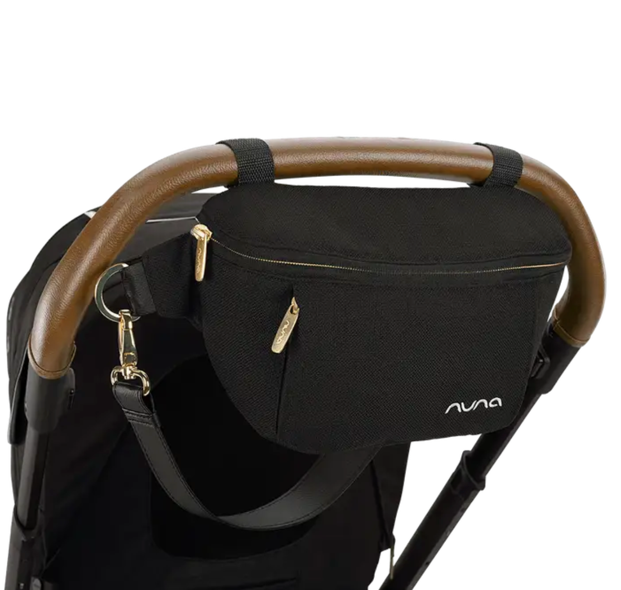 Keep it in reach while on the go. Small in size but big on detail, the Nuna stroller sling bag has six inside compartments and two outside for easy access to essentials. Compatible with all Nuna strollers (except the TRVL™) it easily attaches to the push bar, keeping it organized and in reach. A luxe leatherette carry strap quickly converts it to an over-the-shoulder tote bag. Just attach or remove and go.