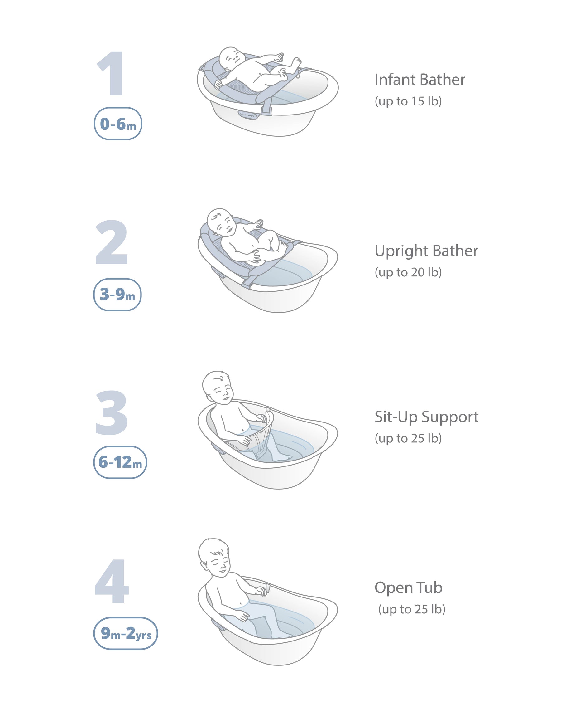- 4 Grow-With-Baby Stages: Infant Bather (0-6m; up to 7 kg/15 lbs; Upright Bather (3-9m; up to 9 kg/20 lbs); Sit-up Support (6-12m; up to 11,5 kg/25 lbs); Open Tub (9m-2yrs; up to 11,5 kg/25 lbs)